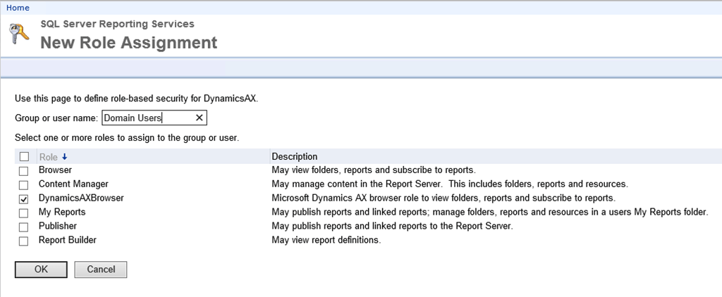 Enter Domain users and check DynamicsAXBrowser… Since AX is normally handling the security of which data is displayed in the report it is not a problem to add Domain Users… I the user is not an AX user no data will be displayed